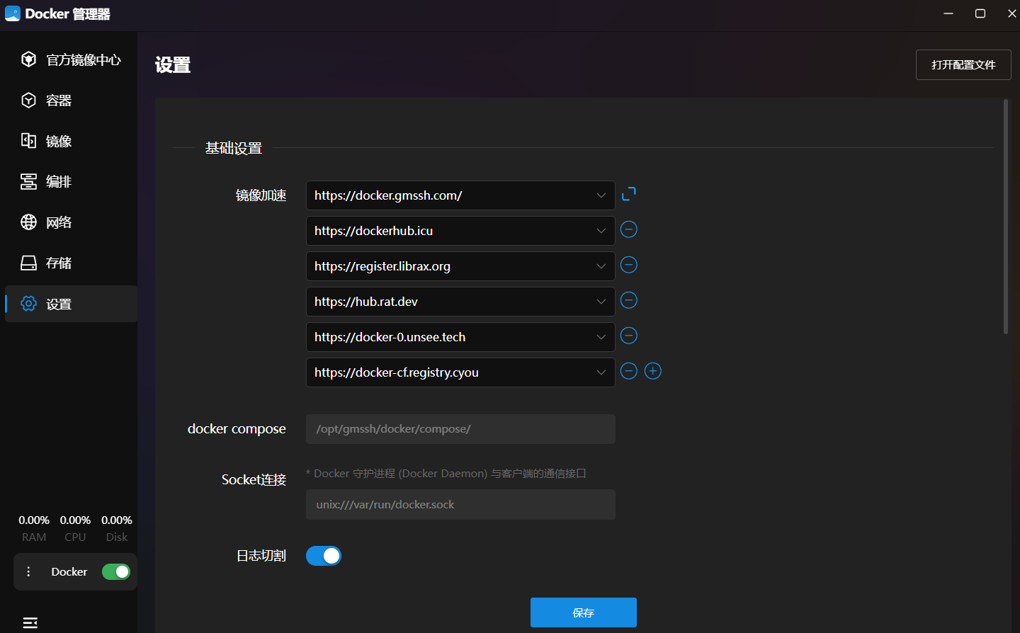安装完成后,在设置选项中可以看到系统已预设了多个高质量的国内镜像源。上图展示了镜像源管理界面,这对于在国内环境下加速拉取镜像至关重要。