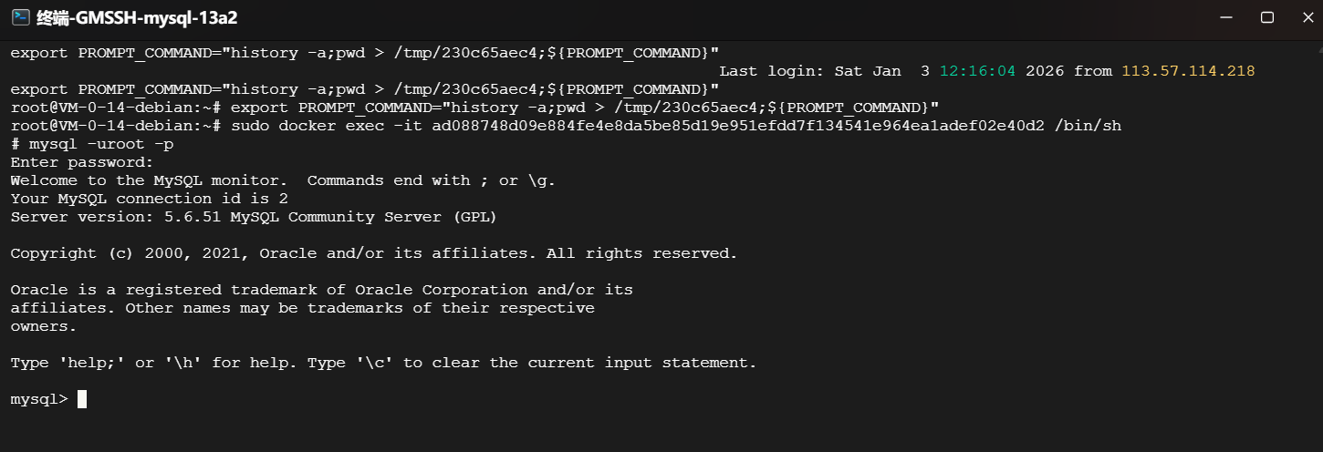 在容器内部输入 mysql -uroot -p 命令,并填入之前设定的密码。如上图所示,成功进入MySQL交互命令行。