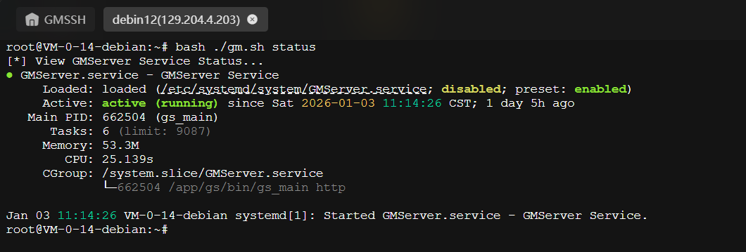 通过执行 bash ./gm.sh status 命令,可以实时查看服务的运行状态。上图中的绿色运行标志表明各组件均处于正常工作状态。