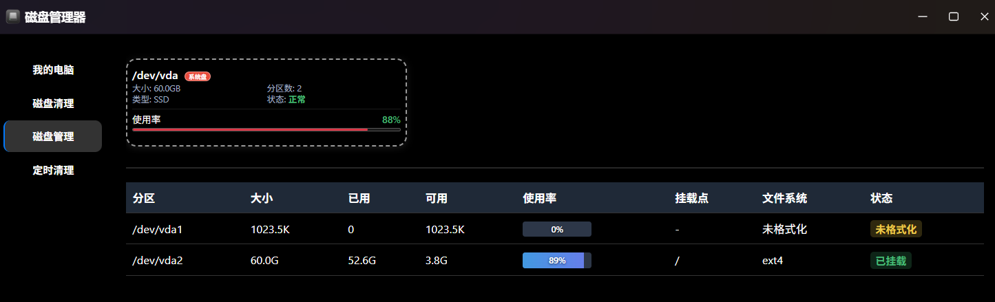 GMSSH内置的可视化磁盘清理工具改变了这一现状。上图展示了清理工具的主界面,用户可以清晰地看到磁盘的挂载详情、总容量、已用空间及剩余百分比。