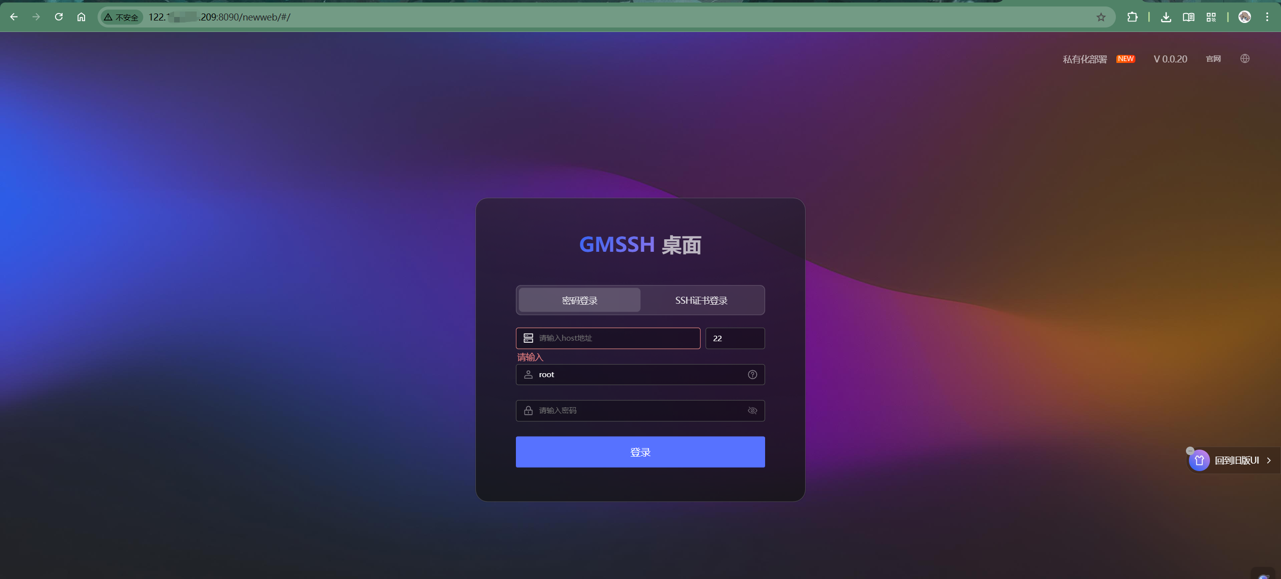 完成端口开放后,在浏览器中输入对应的访问地址,即可看到GMSSH的引导界面。上图展示了成功加载后的登录页,说明Docker部署流程圆满完成。