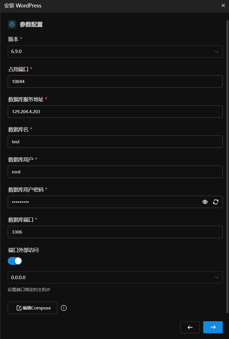 系统弹出了参数编辑框,如上图所示。在这里需要设定数据库的端口、Root密码以及持久化卷的路径。