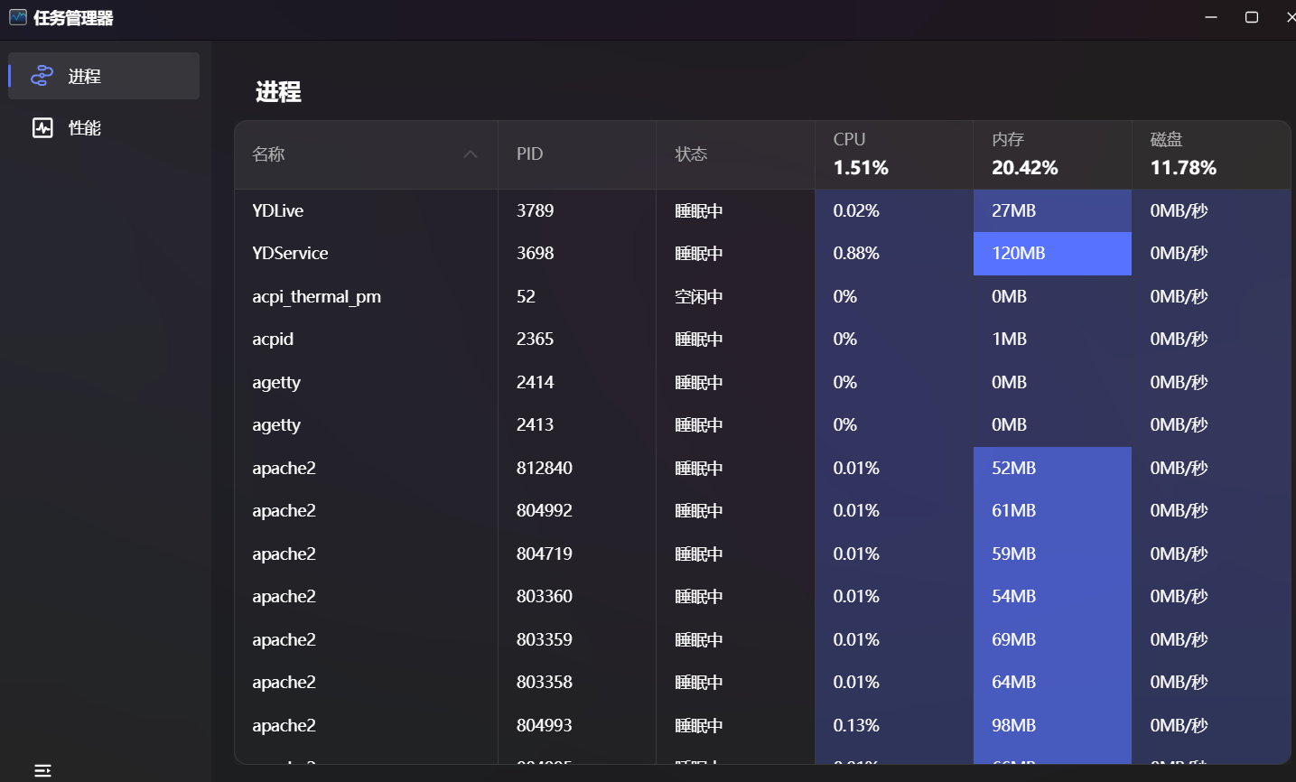 上图展示了进程级别的任务管理器。可以清晰地看到每一个正在运行的进程ID、CPU占用、内存占用以及启动用户。点击右侧操作按钮,可以实现进程的强制停止。