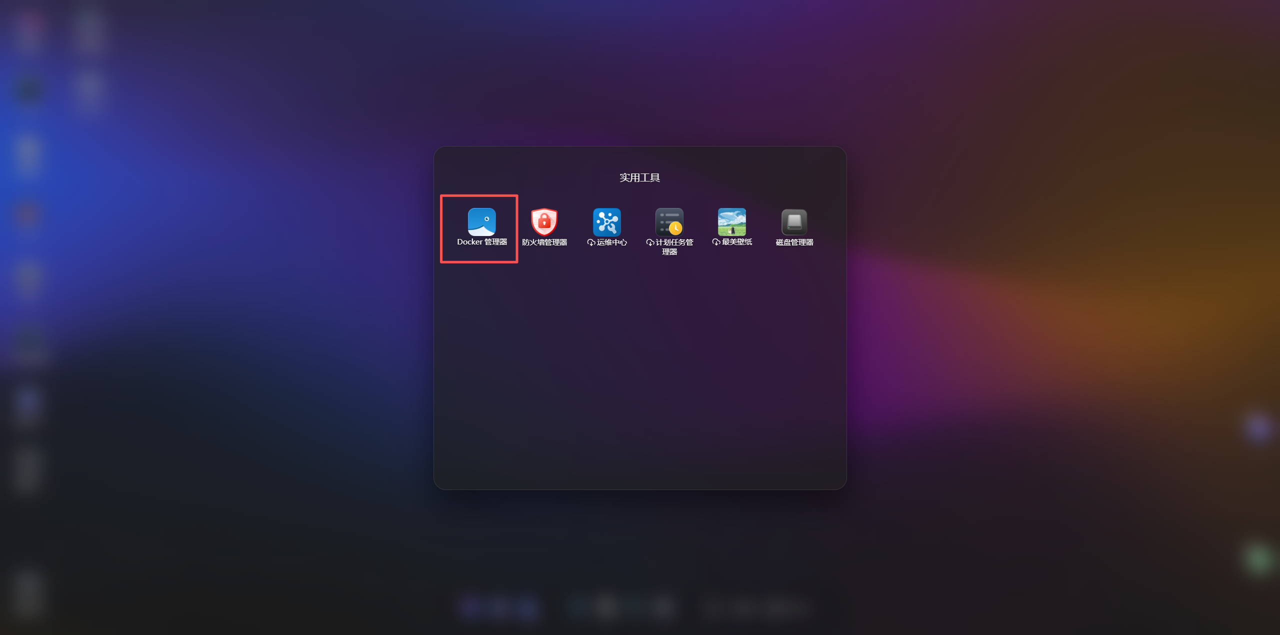 在实用工具栏中找到并点击Docker管理器。上图展示了Docker管理器的入口位置。
