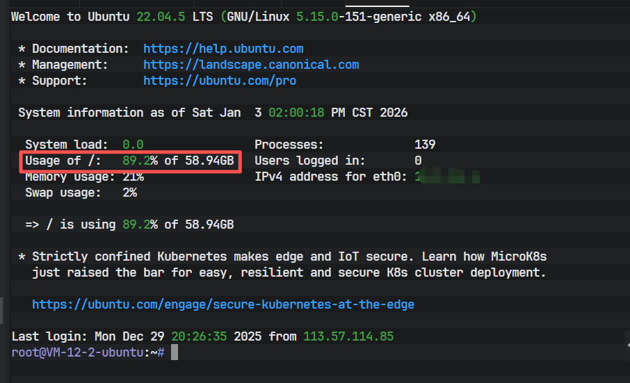 上图反映了一个典型的磁盘告警场景。可以看到根分区的占用率已接近90%,这种情况会导致诸如 git pull 等需要临时空间的写操作直接报错。