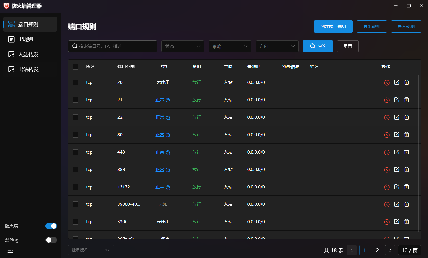 上图展示了防火墙管理器的核心界面。在这里可以一键开启或关闭端口,管理规则列表,且所有变更都会实时作用于系统。
