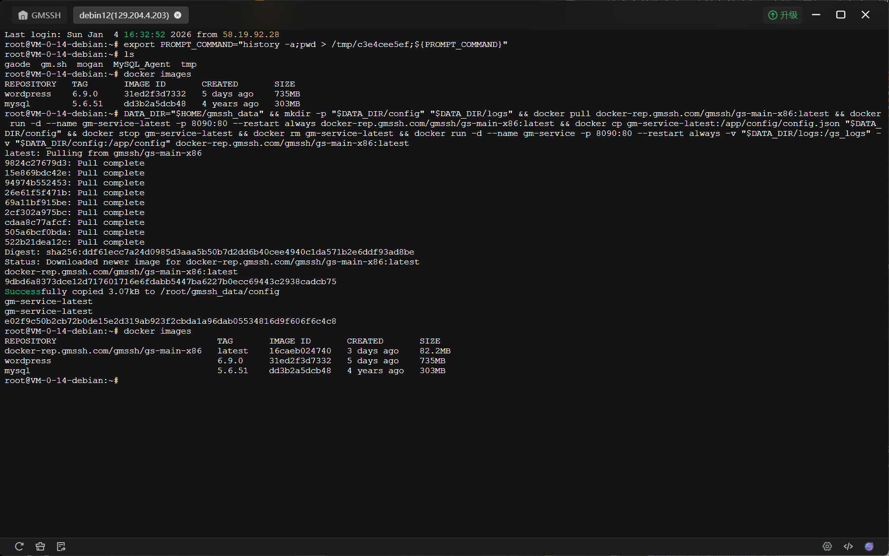 DATA_DIR="$HOME/gmssh_data" && mkdir -p "$DATA_DIR/config" "$DATA_DIR/logs" && docker pull docker-rep.gmssh.com/gmssh/gs-main-x86:latest && docker run -d --name gm-service-latest -p 8090:80 --restart always docker-rep.gmssh.com/gmssh/gs-main-x86:latest && docker cp gm-service-latest:/app/config/config.json "$DATA_DIR/config" && docker stop gm-service-latest && docker rm gm-service-latest && docker run -d --name gm-service -p 8090:80 --restart always -v "$DATA_DIR/logs:/gs_logs" -v "$DATA_DIR/config:/app/config" docker-rep.gmssh.com/gmssh/gs-main-x86:latest