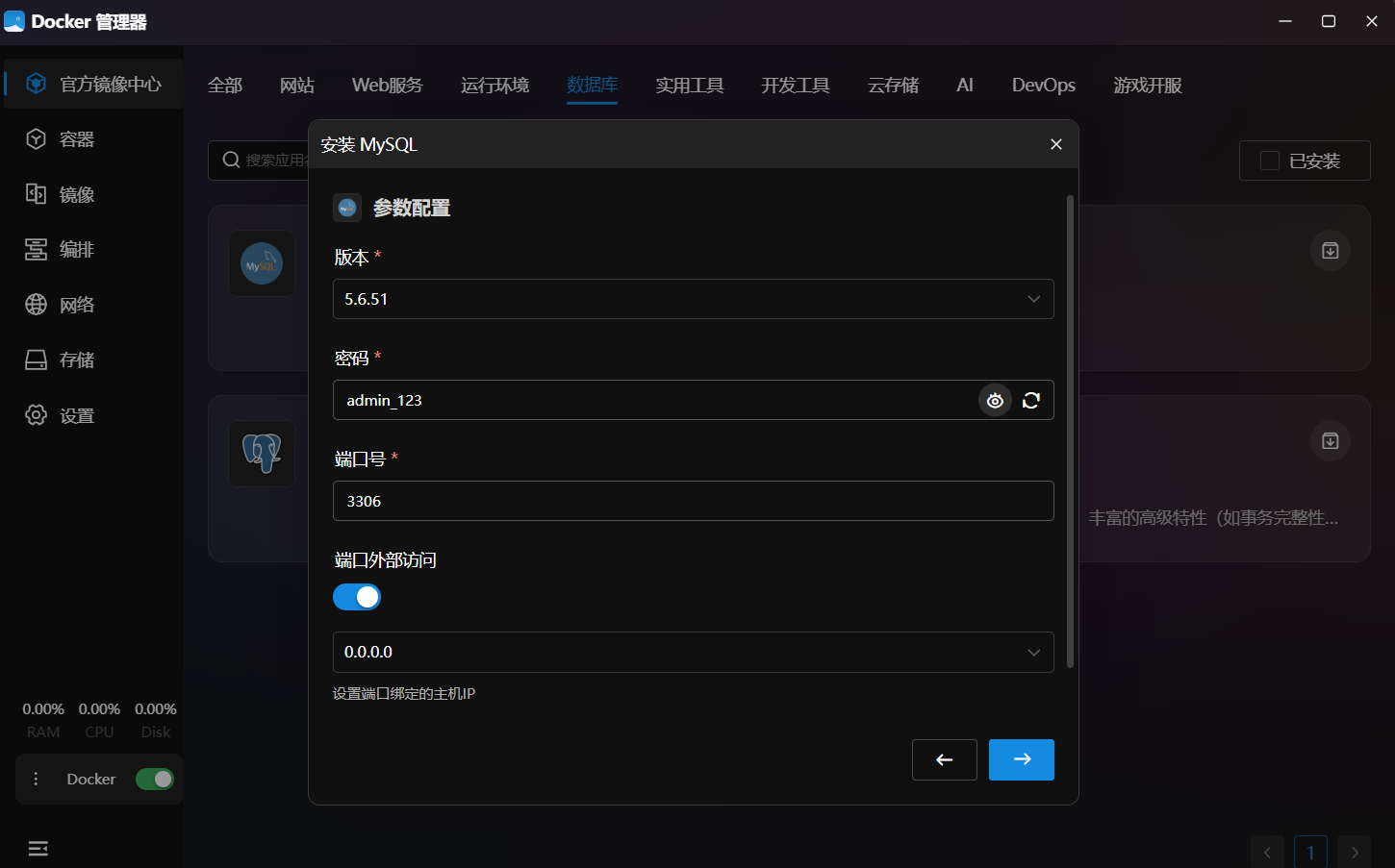 在上图中,用户在应用商店中选择了MySQL镜像。