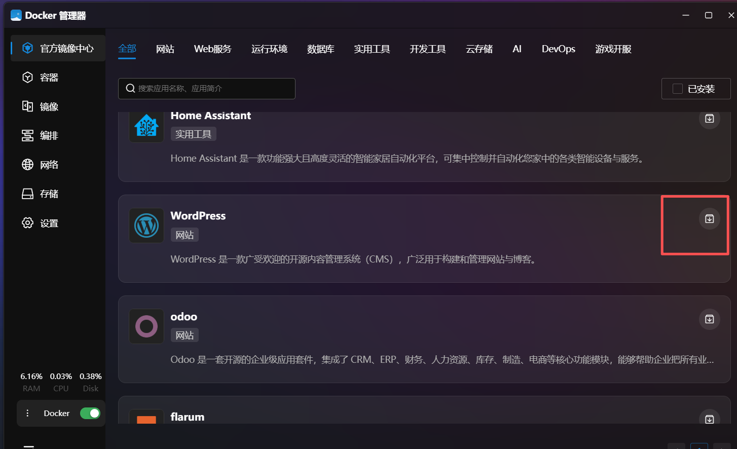 在上图的应用搜索框中定位到WordPress官方镜像。