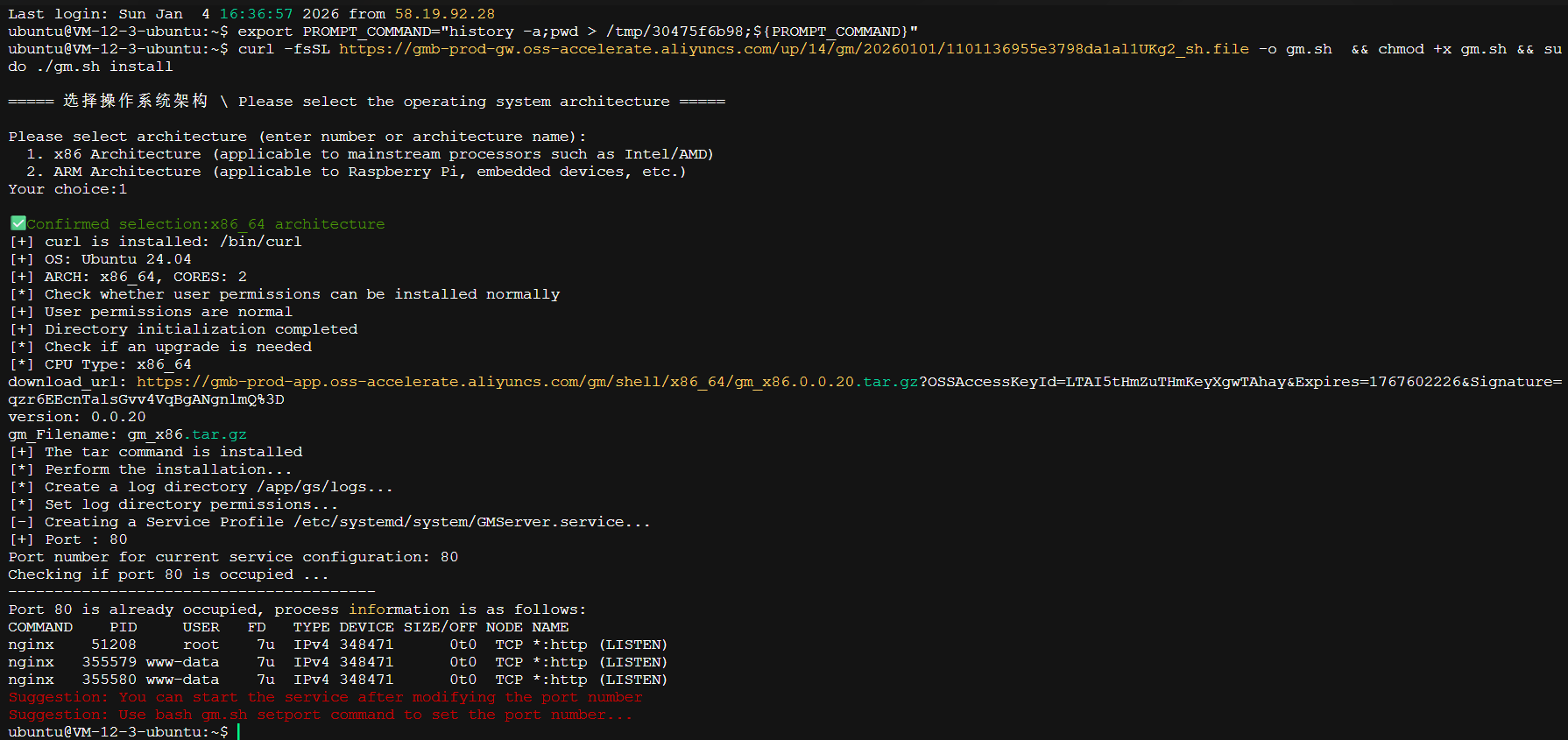 在上图的安装过程中,系统提示80端口已被Nginx服务占用。这是脚本安装模式下的常见冲突,GMSSH表现出了良好的交互性,提示用户可以自定义安装端口。