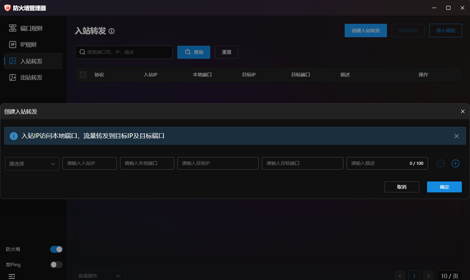 更为强大的是其转发管理功能。上图展示了入站转发与出站转发的配置弹窗。运维人员可以轻松实现内网穿透或流量导流,这在多机协作环境中具有极高的实用价值。