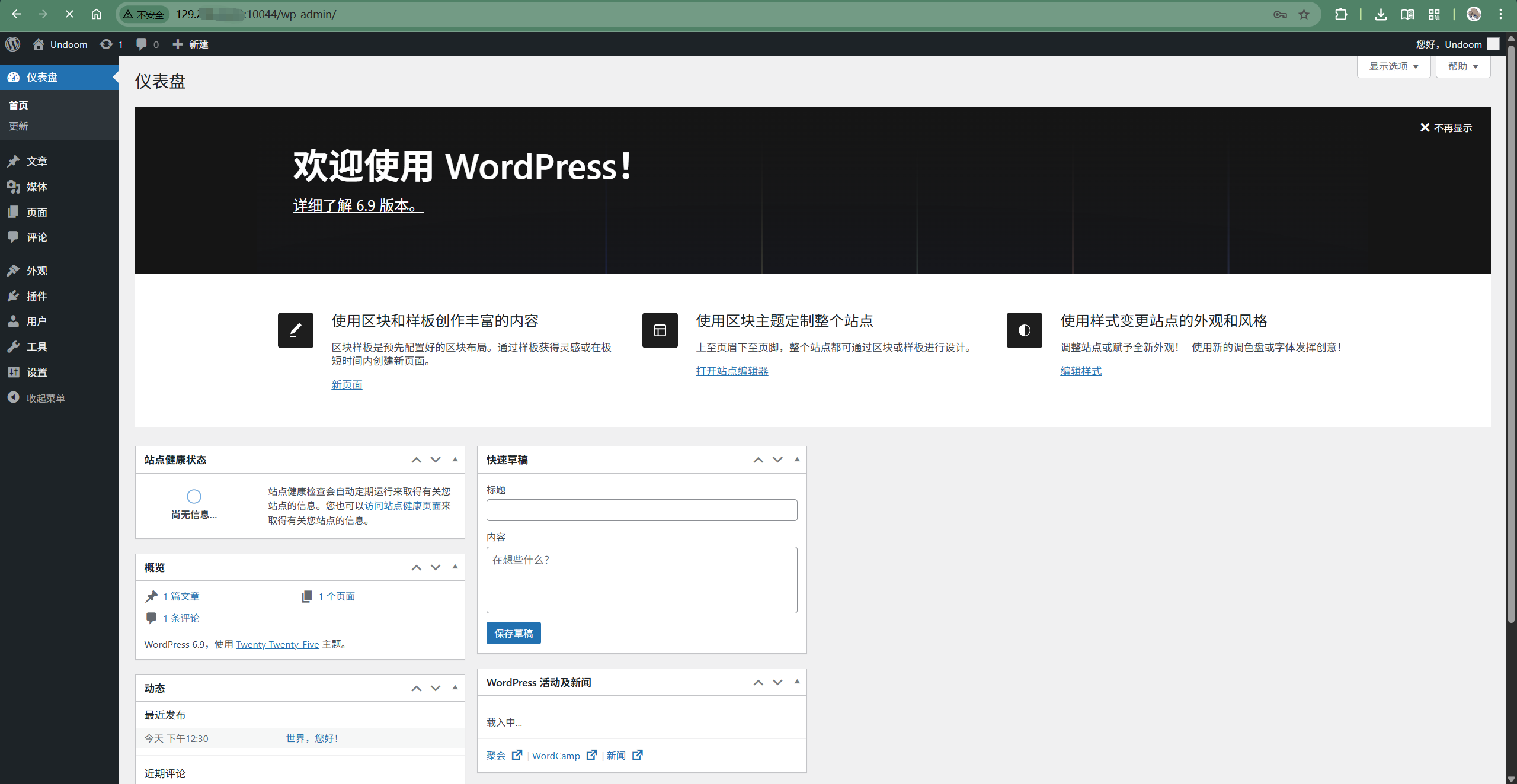 通过管理员账号登录后台。上图显示了功能齐全的WordPress管理面板,至此,博客系统已完全由GMSSH引导并部署在Docker环境中。