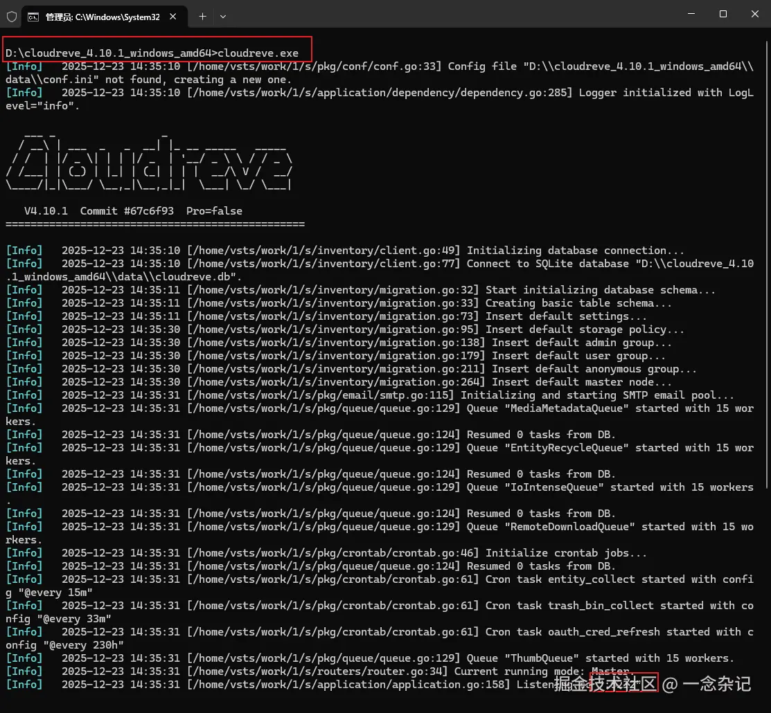 启动也是非常的简单,打开命令行工具,进入解压后的工具目录直接运行cloudreve.exe文件即可启动。