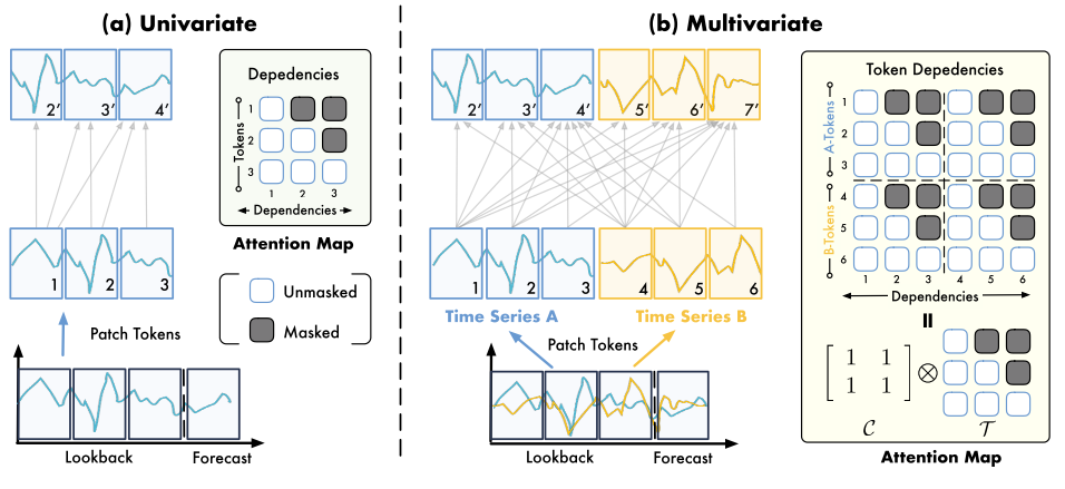 基于分块(Patching)后的二维时间序列单元,每个位置的下一词预测不仅依赖于该序列的历史变化(时序因果性),还依赖于相关变量的外生关联.