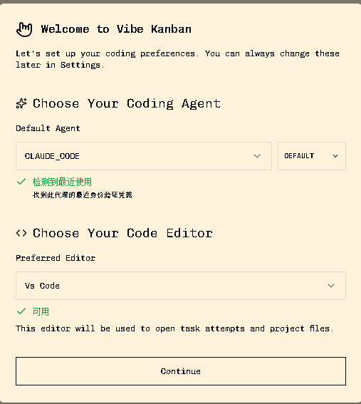 在Vibe Kanban的Settings界面中,集中配置支持的AI代理 ,包括API密钥和运行参数: