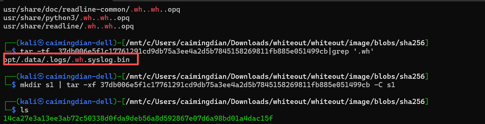 tar -tf 37db006e5f1c17761291cd9db75a3ee4a2d5b7845158269811fb885e051499cb|grep '.wh'
