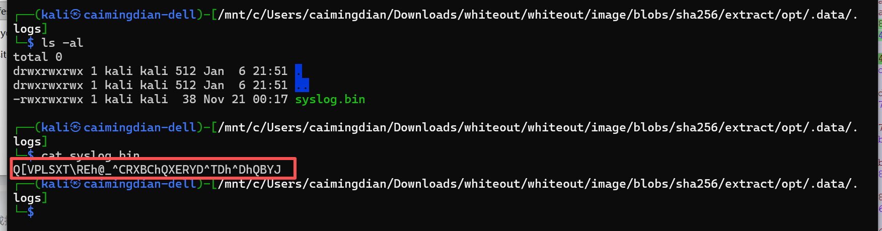 mkdir -p extract | tar -xvf d53154d4f2499c5c31fdd61d359d2a9a0b9076ac639b102bb913c752f5769cfb -C extract opt/.data/.logs/syslog.bin