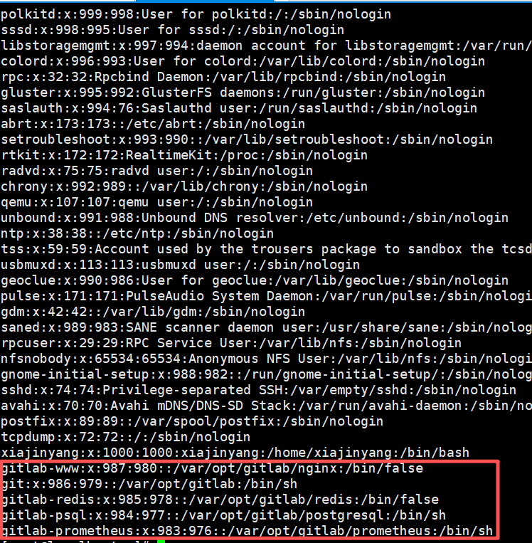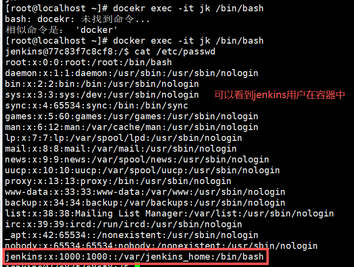其实要区分密钥应该在哪配置很简单,我们要弄清楚jenkins的操作和git操作是由谁来进行的,实际上jenkins的操作都有jenkin用户进行的,那么我们配置密钥时,一定要将私钥配置给jenkins用户,因此我们先要搞清楚jenkins用户到底是在容器内还是宿主机中,配置密钥是公钥与私钥会默认配置到操作用户的家目录下,接下来我们看看两个用户在容器中还是在宿主机中。