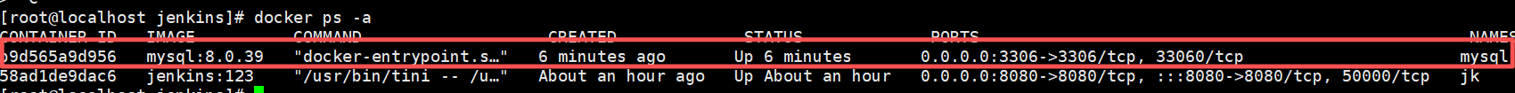 docker run -d --name mysql -p 0.0.0.0:3306:3306 -e MYSQL_ROOT_PASSWORD=3208 --restart=always mysql:8.0.39 ------------------------------------创建并运行容器,容器名字为mysql,映射到宿主机的端口为3306,mysql密码为3208,始终保存重启状态。