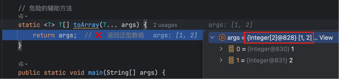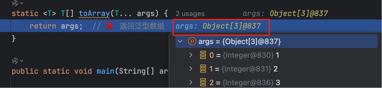 - 看到调用点:toArray(1, 2),推断 T = Integer