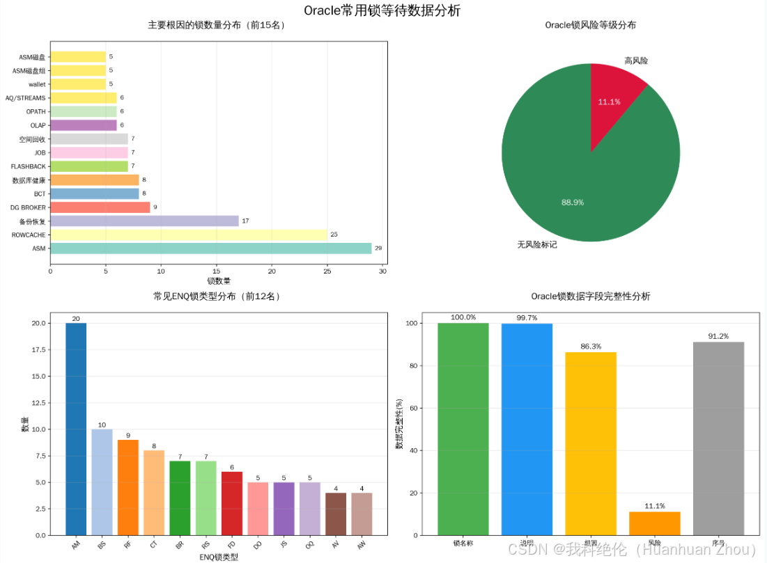 本次分析基于包含351个Oracle锁记录的数据集,涵盖了从序号、锁名称、风险等级、详细说明到根因分析的完整信息。数据完整性分析显示: