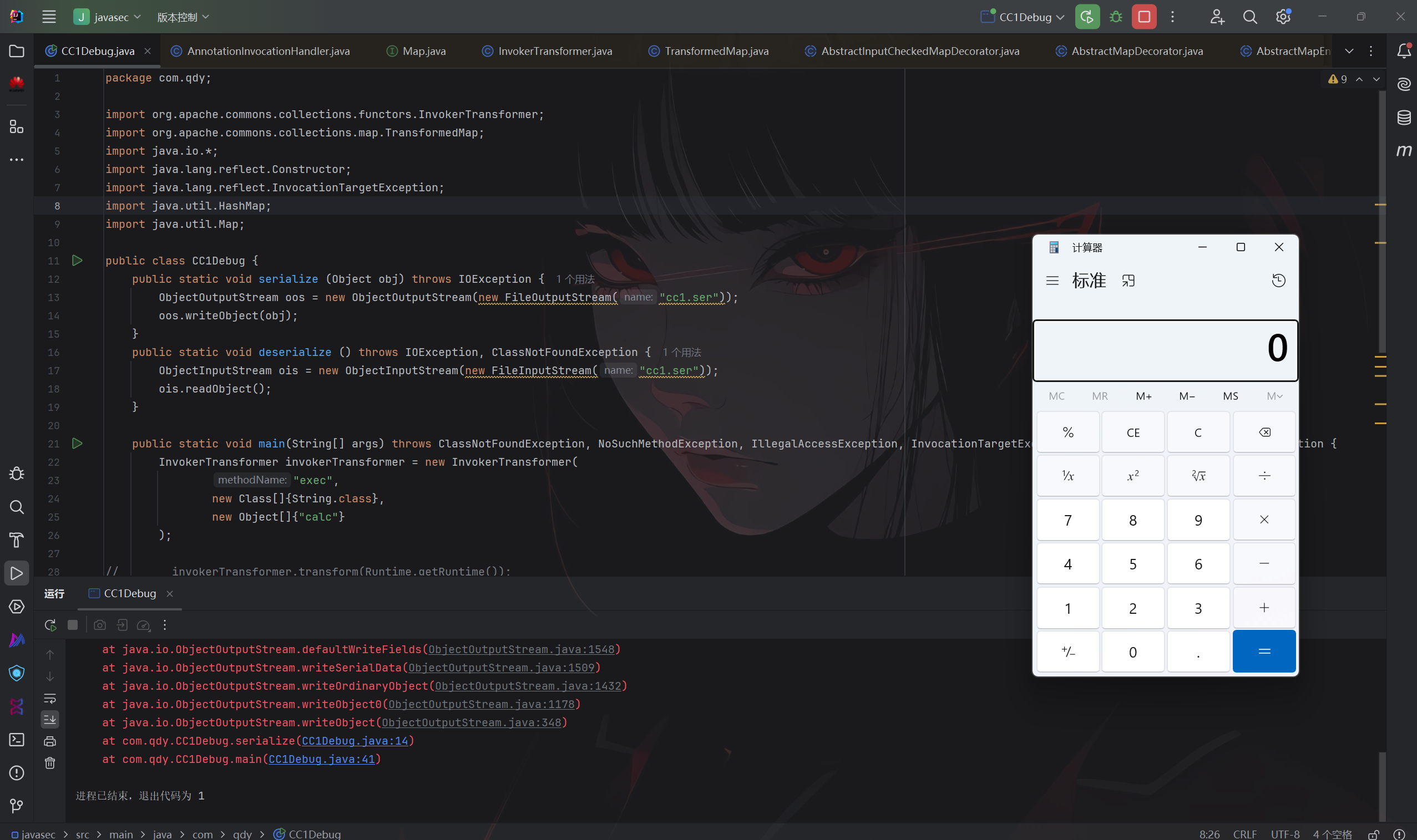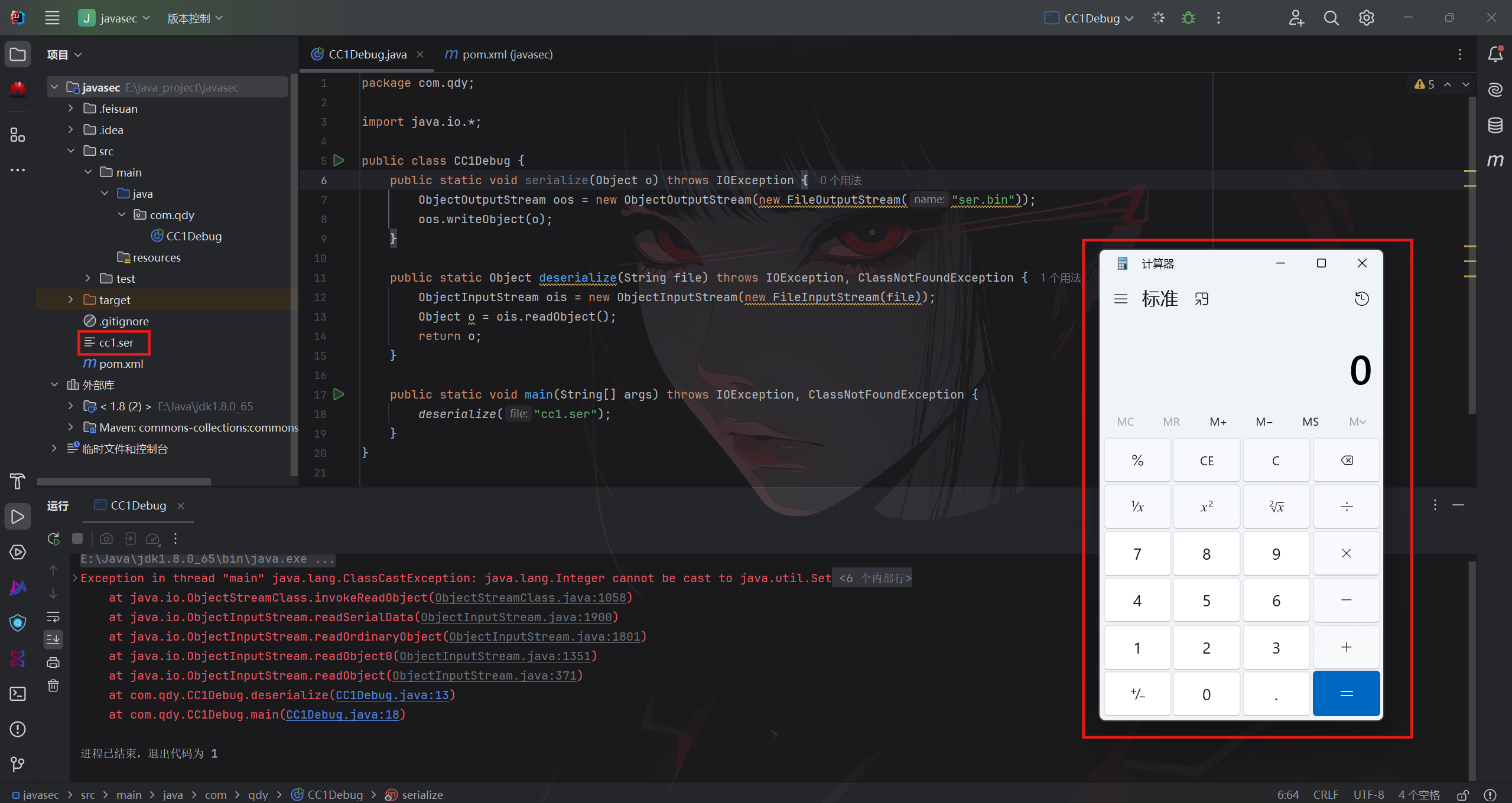 使用ysoserial工具生成cc1链执行calc命令,并保存链到cc1.ser文件内