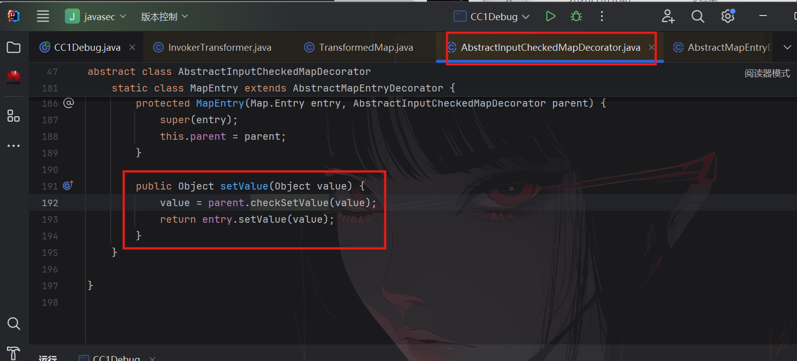 这样就成功利用InvokerTransformer.transform <- TransformedMap.checkSetValue链