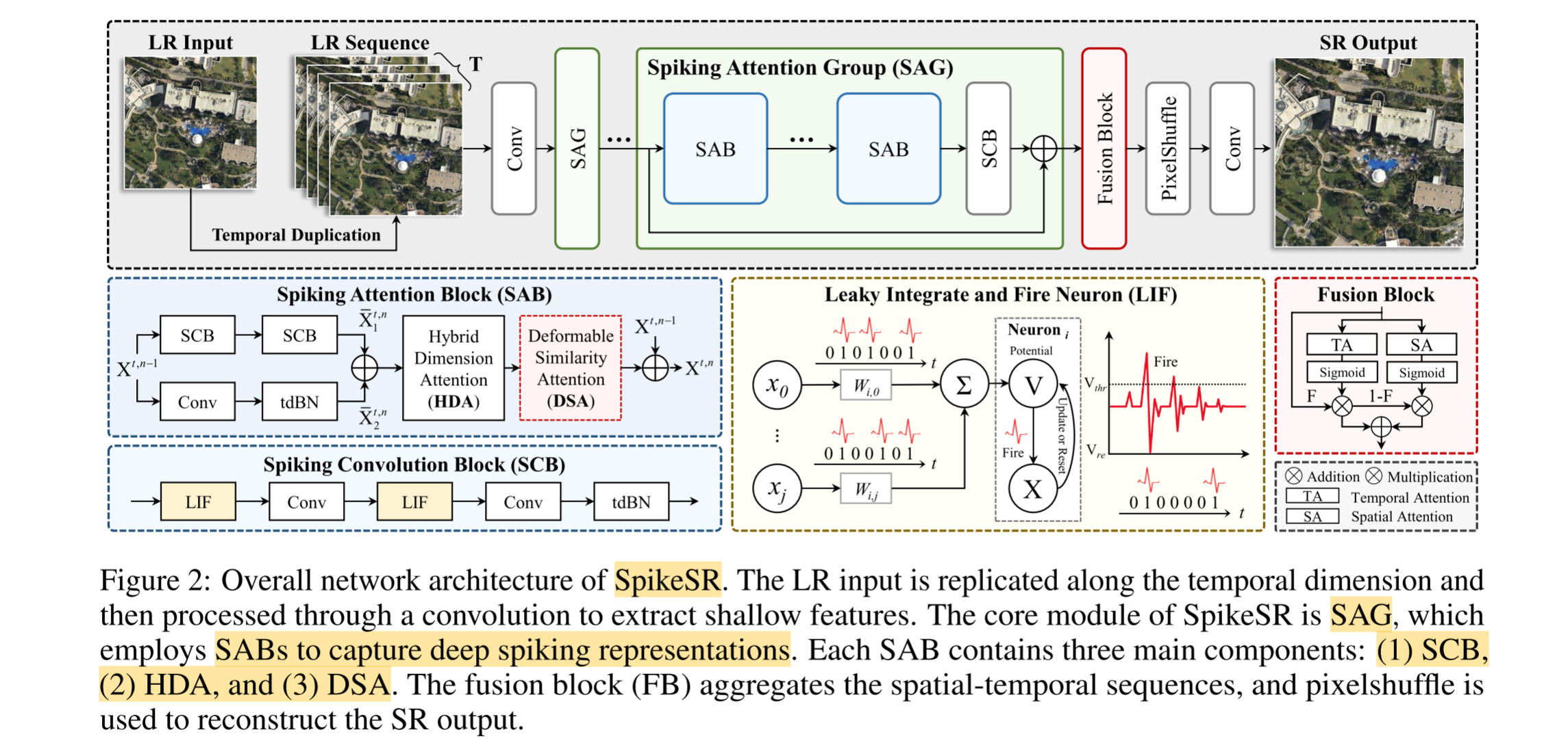 SpikeSR 的整体架构如图所示,以4个堆叠的脉冲注意力组(SAG)为核心模块,每个SAG包含 2 个脉冲注意力块 SAB、1 个脉冲卷积块 SCB 。