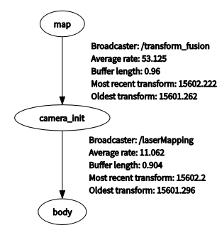 这里map和camera_Init之间的转换关系是由点云和地图匹配确定(可以和i理解为运行重定位时机器人的位置在map中的位姿),camera_Init和body之间是激光雷达里程计