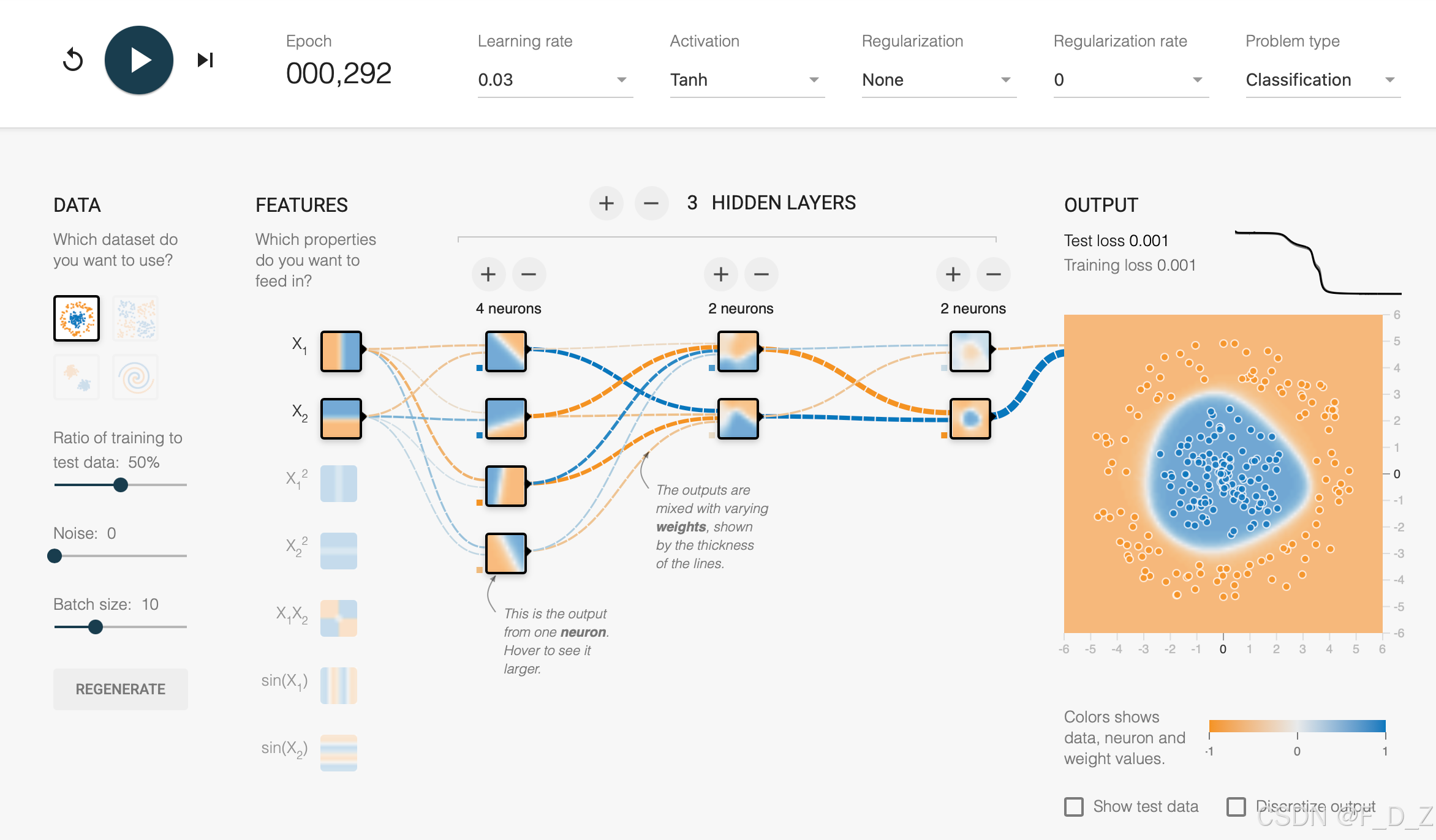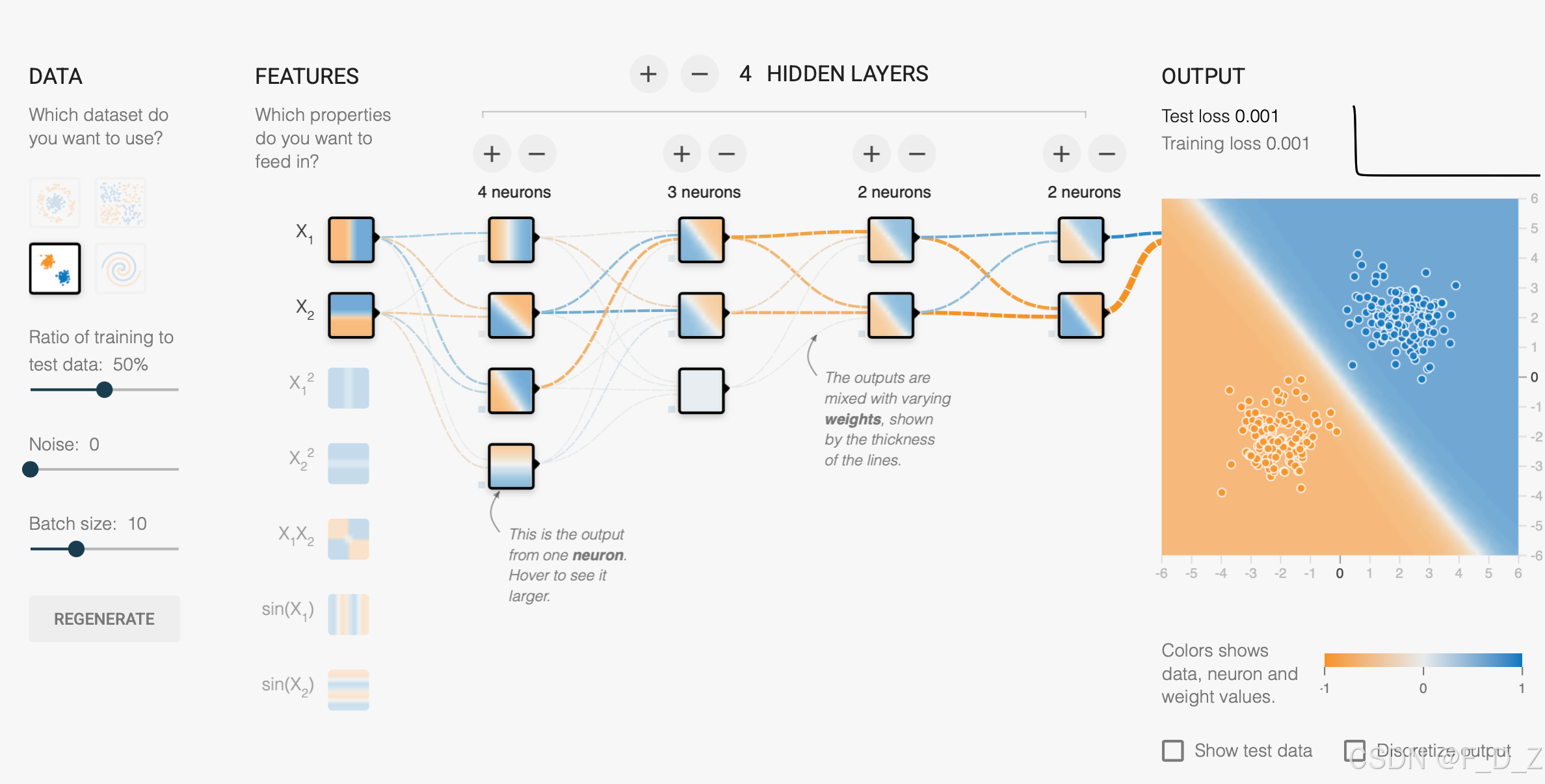 - 数据生成器:点击"DATA"→"REGENERATE"可重新采样;拖动"Noise"滑块给数据加噪,观察鲁棒性。