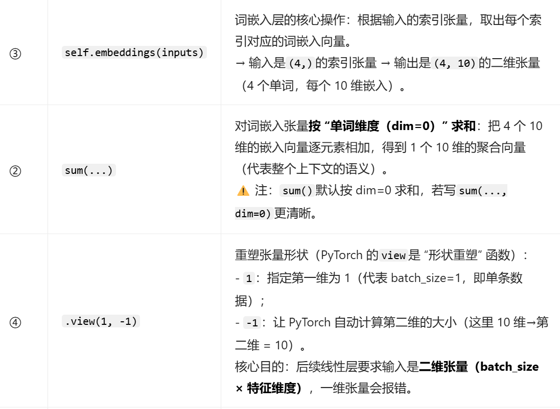 sum vs mean :求和(sum)和求平均(mean)都是常见的聚合方式,比如把代码改成torch.mean(self.embeddings(inputs), dim=0).view(1, -1),逻辑完全等价 ------ 求平均只是把求和结果除以单词数,模型训练时会自动调整权重,最终效果无差异。