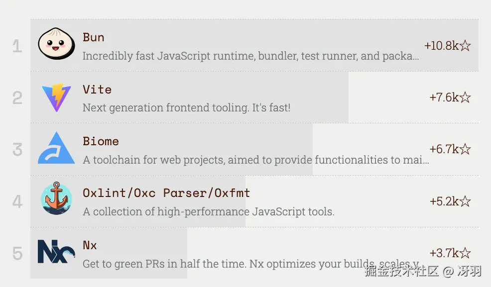 Bun 的持续努力最终获得了回报,这款一体化 JavaScript 工具包荣登榜首。在过去的一年中,它不断提升性能、增强对Node.js 的兼容性,并推出许多实用新功能,使其成为全栈 JavaScript 开发的理想平台。年底,Bun 被 Anthropic 收购,我们非常期待 2026 年 Bun 的发展。