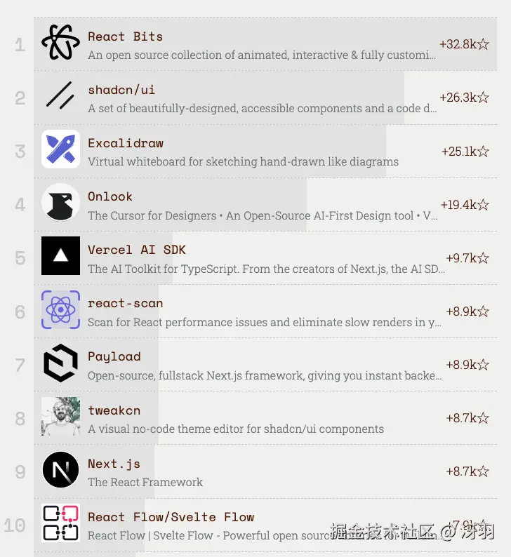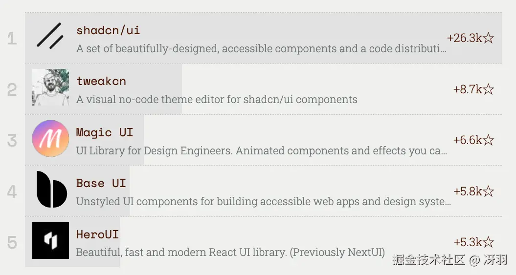 shadcn-ui 是 2023 年和 2024 年的冠军,2025 年依然保持了强劲的发展势头。