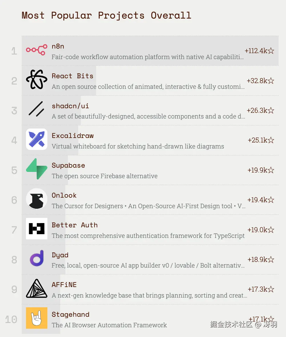 此榜单根据 2025 年 GitHub 新增的星标数量,还建立了以下榜单: