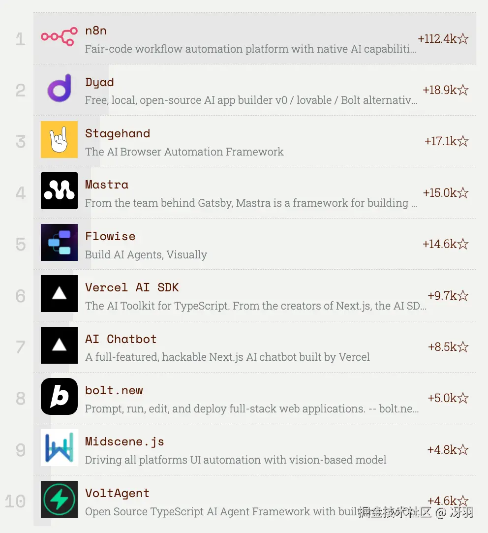 Dyad 、Flowise、Mastra 和 Stagehand 等公司堪称自动化和代理工作流领域的佼佼者。Vercel 仍然是那些希望从底层掌控聊天和代理流程的用户的首选(但他们也在不断添加代理功能)。TanStack AI 虽然是后起之秀,但凭借其强大的代理功能,正在迅速崛起。