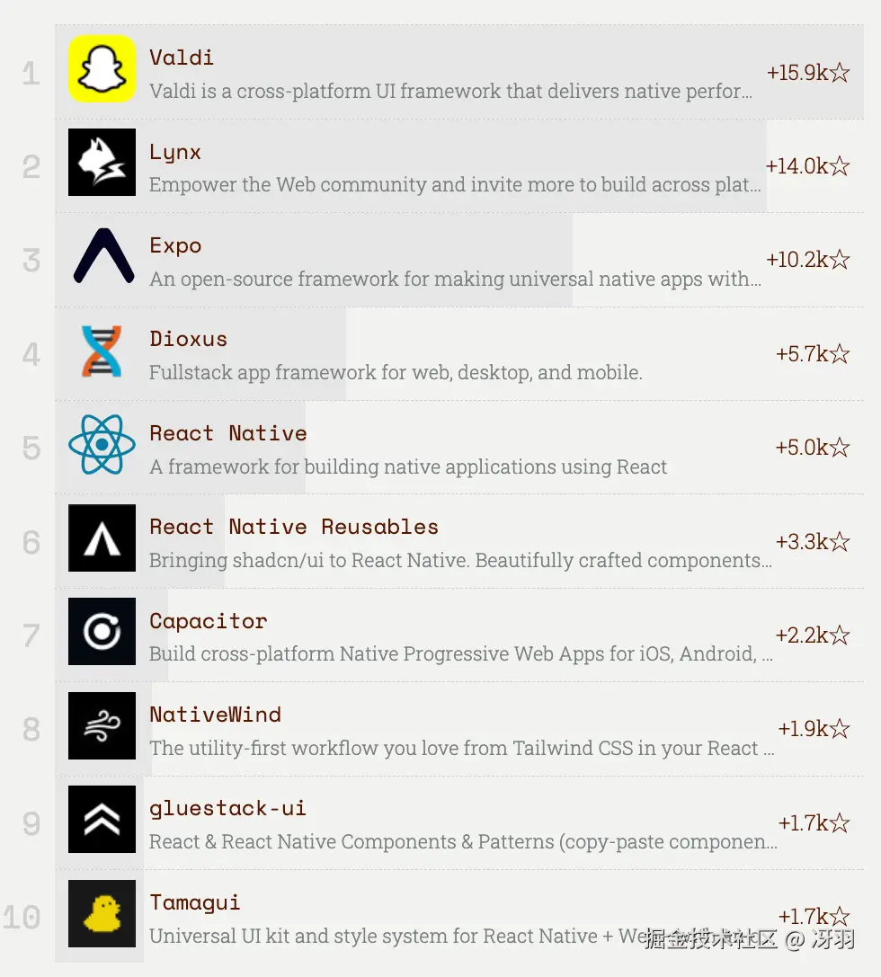 在 JavaScript Rising Stars 评选活动长达十年的历史中,React Native 及其主要元框架 Expo 首次未能跻身移动端榜首。取而代之的是两个新晋框架 Valdi 和 Lynx------它们分别是 Snap(Snapchat 的母公司)和字节跳动(TikTok 的母公司)的内部框架。