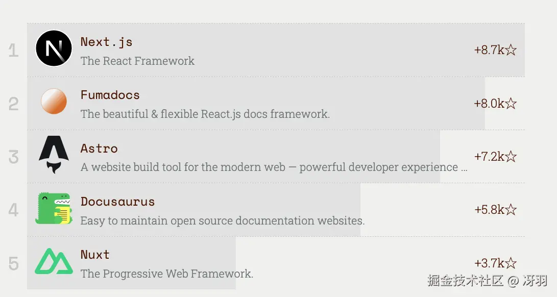 Astro 位列第四,它继续闪耀着光芒,作为一个多功能的框架,可以构建内容丰富的应用程序(例如您喜爱的 JS Rising Stars!),同时提供良好的开发者体验并注重性能。