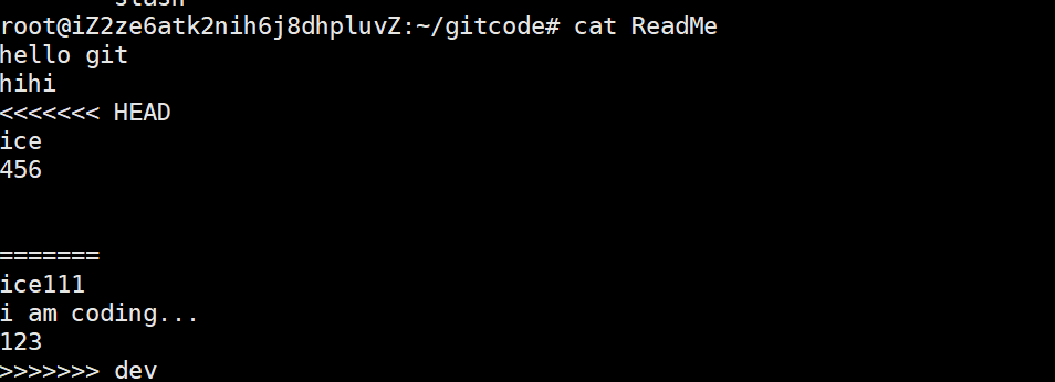 有这样一个场景,在dev分支下有句代码是123,而在master分支下该部分代码为456,当想将两个分支合并时,会出现冲突