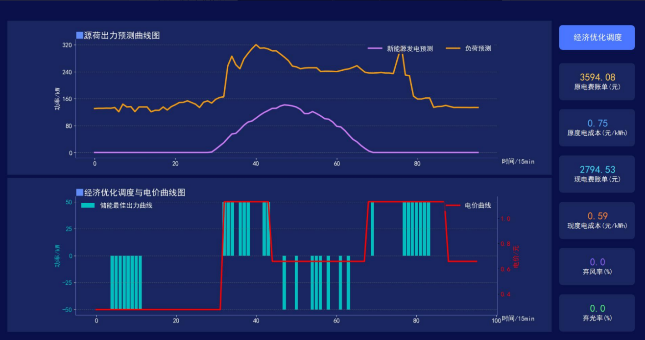 系统的功能设计紧密围绕零碳园区的实际需求展开。例如,通过全景监测与可视化管理,管理者可以直观掌握园区内能源流动、设备状态与关键指标,形成虚拟能源网络,提升管理透明度。在多能协同与智能调度方面,系统结合光伏与负荷预测,动态调整运行策略,实现新能源最大化就地消纳,并通过储能系统的经济优化运行------如削峰填谷、需量控制与柔性扩容------显著降低用电成本。
