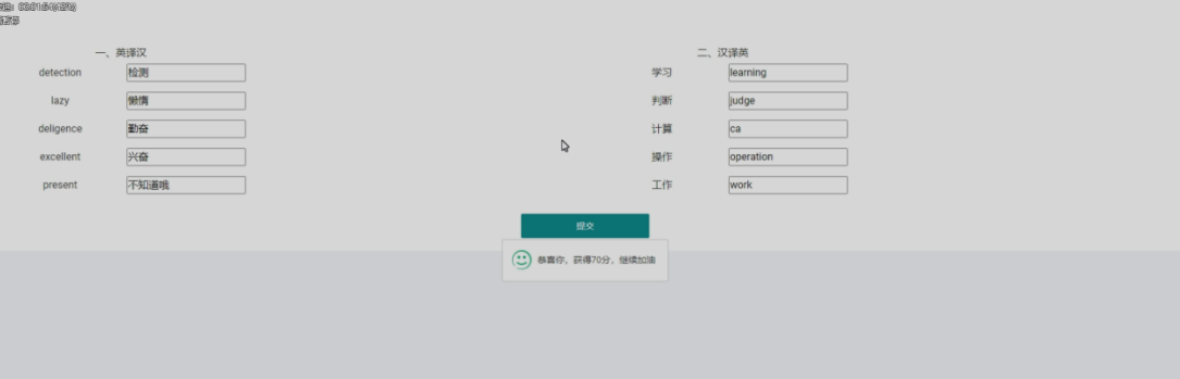 在在线测试功能的展示页面中页面的左边为"英译汉"有五个单词供考试人员进行翻译,将翻译完的汉语填入对应的文本框中,第二列为汉翻英,将翻译后的英语填入文本框中,当两列都填写完毕后,点击提交即可进行考试的交卷。