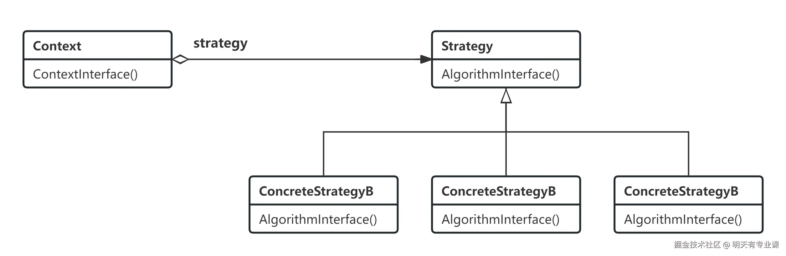 - 以Strategy接口实现某个具体算法,如微信的支付算法,支付宝的支付算法。