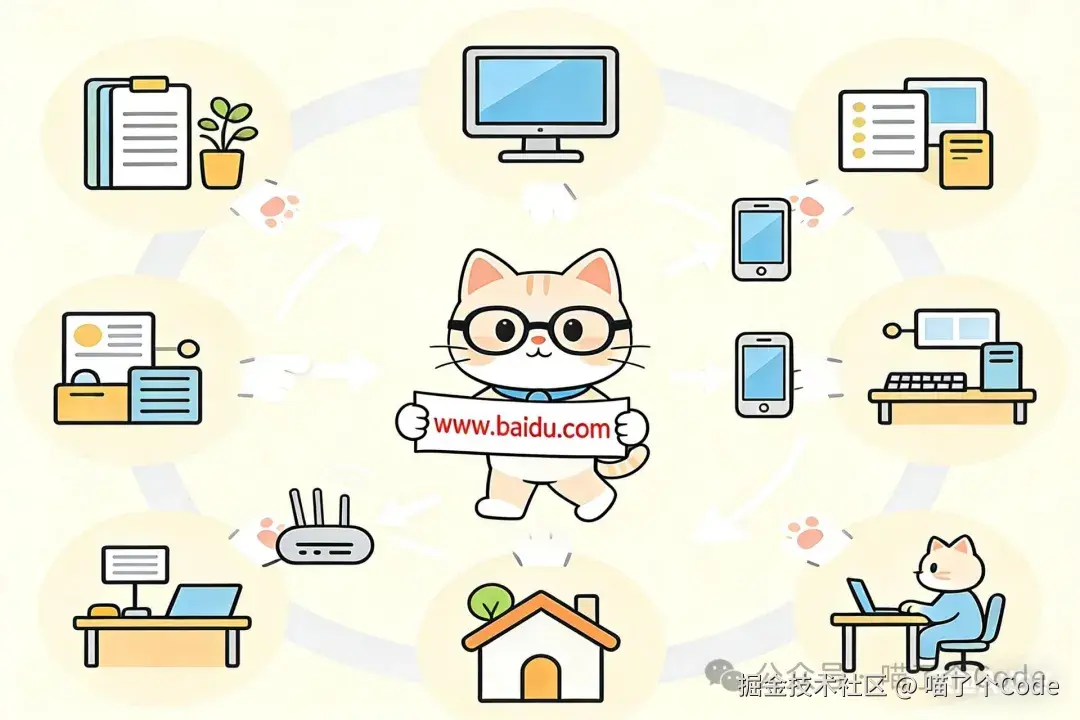 我们以"输入www.baidu.com,按下回车,看到百度首页"为例,完整拆解每一个环节。就像跟着快递的运输路线,从你下单(输入URL)到收到包裹(看到页面),每一步都给你讲清楚。