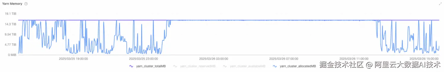 原集群是一个典型的服务器架构,困境是,资源要么长期被打满,要么在空窗期大量闲置。图中 yarn_cluster_totalMB 基本是一条平直的上沿线,代表集群的总内存容量是固定不变的;而 yarn_cluster_allocatedMB 在大多数时间几乎贴着这条上沿线运行,意味着集群绝大部分时间都处在全分配的状态。看上去利用率很高,但从架构与交付视角,这更像是在提示:集群已经被当作一个"刚性资源池"使用,而不是一个能够平滑承接业务波动的弹性资源底座。