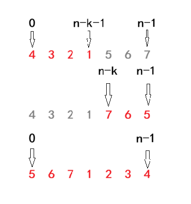 前n-k个元素逆置[4,3,2,1,5,6,7],后k个元素逆置[4,3,2,1,7,6,5],整体逆置[5,6,7,1,2,3,4],三次逆置总操作数为n/2 + k/2 + (n-k)/2 = n,所以这种方法的时间复杂度为O(N)