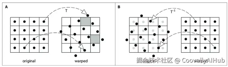根据流动方向,扭曲可以分为前向扭曲和后向扭曲。前向扭曲使用流场将源帧的每个像素映射到目标帧,但有些像素可能会落在有效图像区域之外,导致缺失或未定义的区域(见A图)。而后向扭曲则指定每个目标像素如何从源帧采样,从而避免了这些缺失区域。
