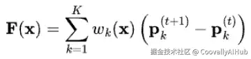 流扭曲可以用上面的方程表示,其中 p = (x, y) 表示像素坐标,(u, v) 表示光流的水平和垂直分量。这个方程定义了一个像素级的映射,描述了源帧 x0 中的像素如何被移动到目标帧 x1 中,将每个在 (x, y) 的像素映射到 (x + u, y + v)。