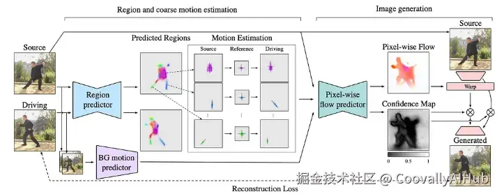 - 区域预测器: 从输入图像中提取一组关键区域,每个区域代表一个局部运动组件。这些区域提供了参与运动的物体部件的结构化和紧凑表示。