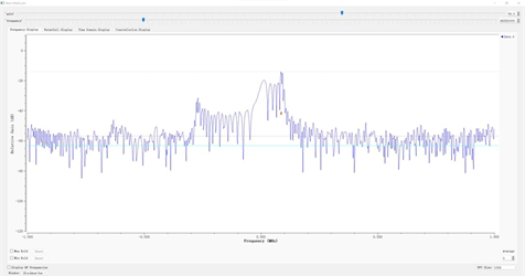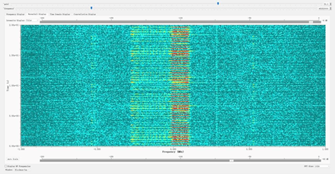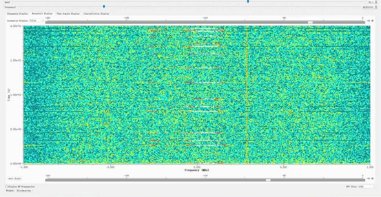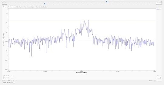 从3米外采集的20kbps GFSK信号在3米处的频谱监控结果如下图所示,从第一张图频率显示图中可以看到,信号的频谱能量确实集中在0MHz附近,相对特性。信号增益波动在-20dB到-80dB之间,3米短距离下信号强度处于可波动、在实际场景里完全能支持稳定接收的范围。再看第二张瀑布图呈现的,在时间轴上0MHz附近位置一直显示着红、黄色的强信号区域,亮块,这也说明这一个20kbps的GFSK信号传输是连续且稳健。