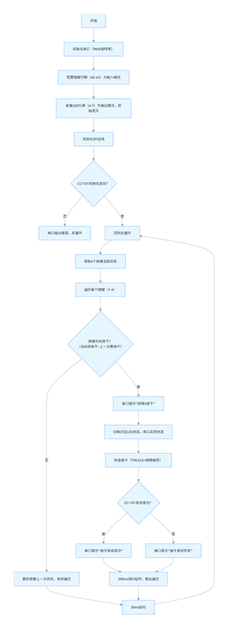 发送端软件主要功能是检测按键,按下按键时切换本地LED灯,并通过无线方式发送控制指令。程序设计使用轮询方式检测按键状态,用状态机模型实现可靠的按键检测和指令发送。程序初始化阶段先配置串口通信,将按键引脚设置为输入上拉模式,LED引脚设置为输出模式,初始化SPI总线和CC1101无线模块。主循环中一直扫描四个按键的状态,采用边沿检测算法检测按键按下。当检测到有效的按键动作时,先切换对应LED的本地状态,给出视觉回馈,之后形成"TOGGLEX"的控制信息,X取值为1-4代表不同的通道,最后经由CC1101模块传送指令数据并采用等待机制保证数据包的完全发送。为了消除机械按键抖动的影响,程序在检测到按键后延时200ms,采用状态保存的方式,保证每次按键只执行一次操作。系统串口输出详细的调试信息,按键事件、LED状态变化、指令发送结果等都可以通过串口输出,方便系统调试和状态监控。