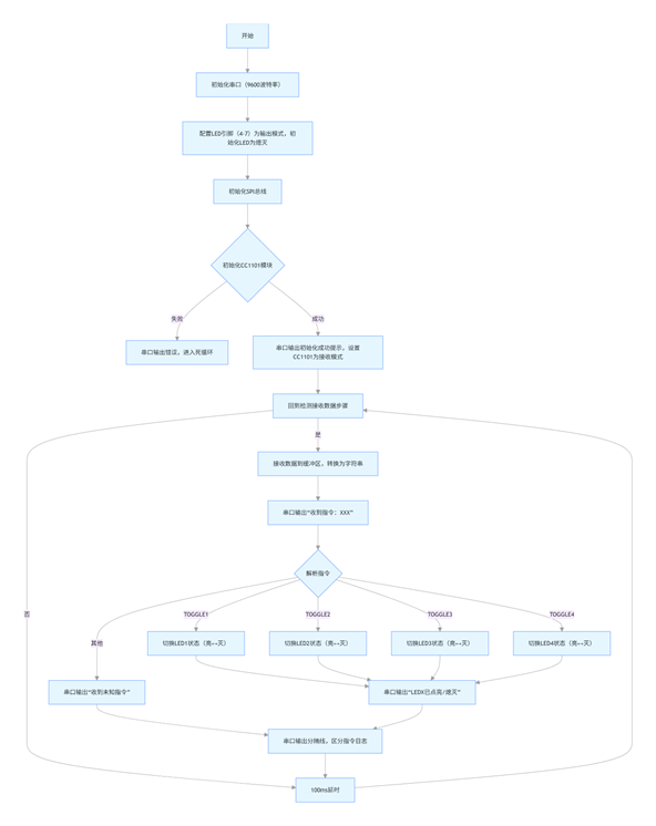 接收端软件负责监听无线信道,接受并解析控制指令,执行相应的LED控制操作。其程序设计采用中断驱动的异步通信方式,能及时响应发送端的控制指令。初始化阶段,接收端将LED控制引脚设置为输出模式,初始化SPI总线,设置CC1101模块的工作参数,保证其和发送端的通信参数完全一致。主循环中程序一直对CC1101模块的接收缓冲区进行检查以监听无线数据。当检测到有效的数据包的时候,程序将原始的字节数据转成字符串格式,并执行指令解析。系统先验证指令格式是否正确,查看是否以"TOGGLE"开头,接着提取指令中的通道编号,找到需要控制的LED目标。指令执行阶段,程序用数字IO操作来改变对应的LED状态,使LED的开关状态发生切换。为了保证系统的可靠性,程序在指令解析时加入了格式校验机制,对非法指令进行过滤。同时系统通过串口实时输出接收到的指令内容以及执行结果,包括原始指令字符串和LED状态变化信息,为系统运行状态监控和故障诊断提供充分的依据。这种设计保证了接收端能够准确、及时地响应远程控制指令,实现可靠的无线控制功能。